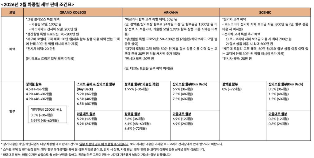 르노코리아의 2026년 2월 고객 혜택에 대한 보다 자세한 내용은 전국 전시장 또는 고객센터를 통해 확인할 수 있다.