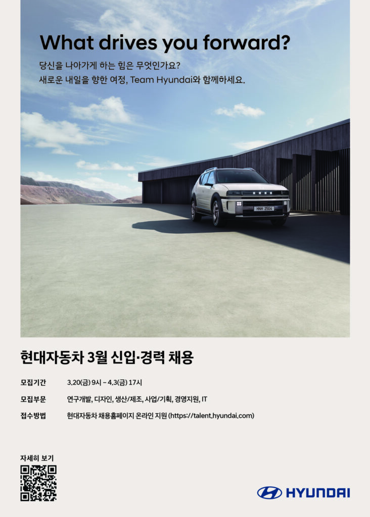 3월 25일에는 현대차 채용 유튜브 채널에서 ‘팀 현대 토크 라이브(Team Hyundai Talk Live)’가 진행된다. 인사 담당자가 직무와 채용 절차를 소개하고 지원자 질문에 답하는 방식으로 진행되며, 3월 22일까지 공식 채용 홈페이지에서 사전 신청한 사람만 참여할 수 있다.